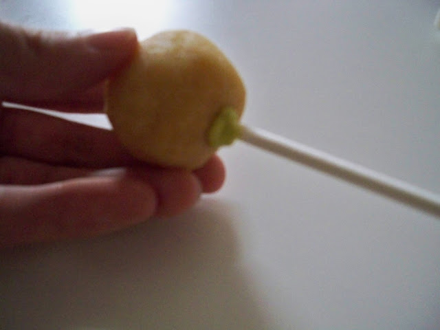 Primero, fundí sólo un poco para mojar la punta de los palitos de piruleta e insertarlos en las bolas, para después refrigerarlas, ya que así, se endurece y las bolas se sostienen sin que se resbalen hacia abajo...